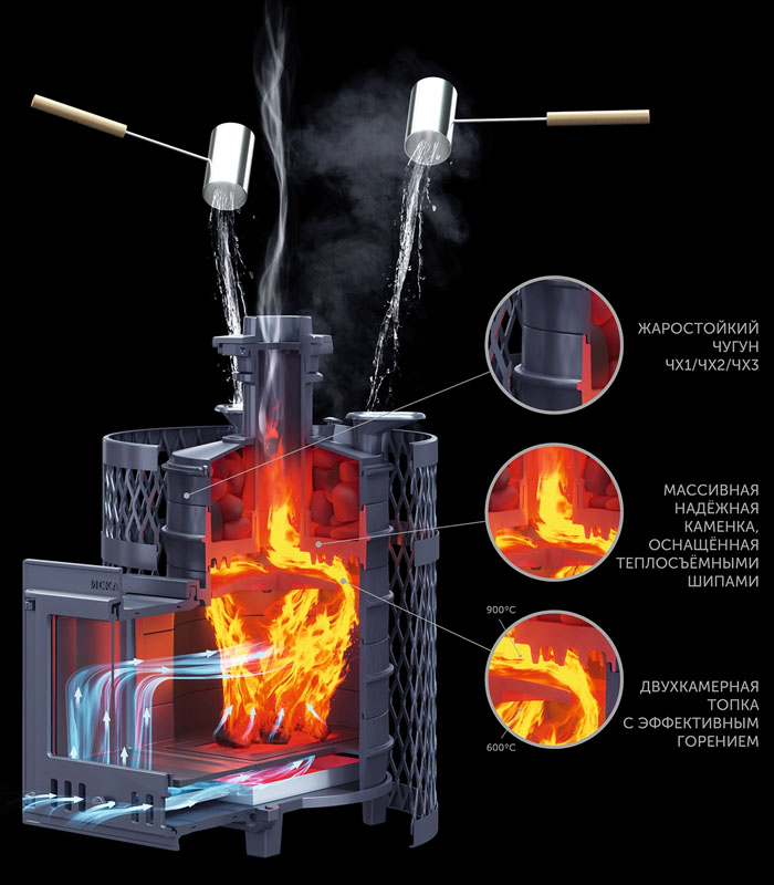Модификация «ТехноЛит Искандер 25 ЗК» — это печь «Искандер ТехноЛит» с закрытой каменкой, двумя паровыми пушками и дверцей для залповой подачи пара.