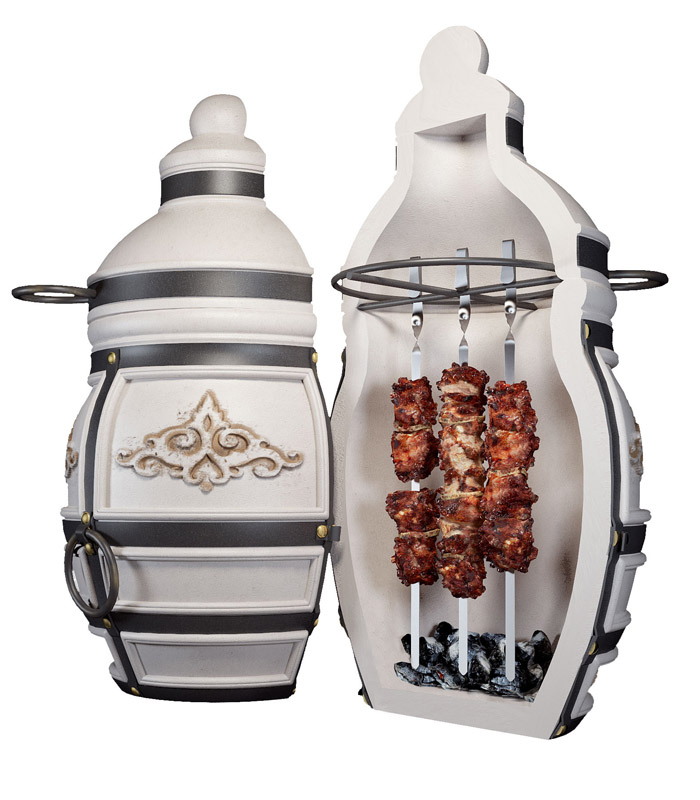 Керамический тандыр «Аполлон» с откидной крышкой имеет вид овального бочонка и выполнена из шамотной глины. Этот экологически чистый материал часто используют для облицовки топок печей. Он хорошо переносит высокие температуры и имеет свойство аккумулировать и сохранять тепло. Равномерное распределение нагрева тандыра в течение 2-3-х часов обеспечивает лучший вкус и аромат каждого блюда. За один розжиг вы приготовите большой объём пищи на семью или компанию, например, около 4-х кг мяса.