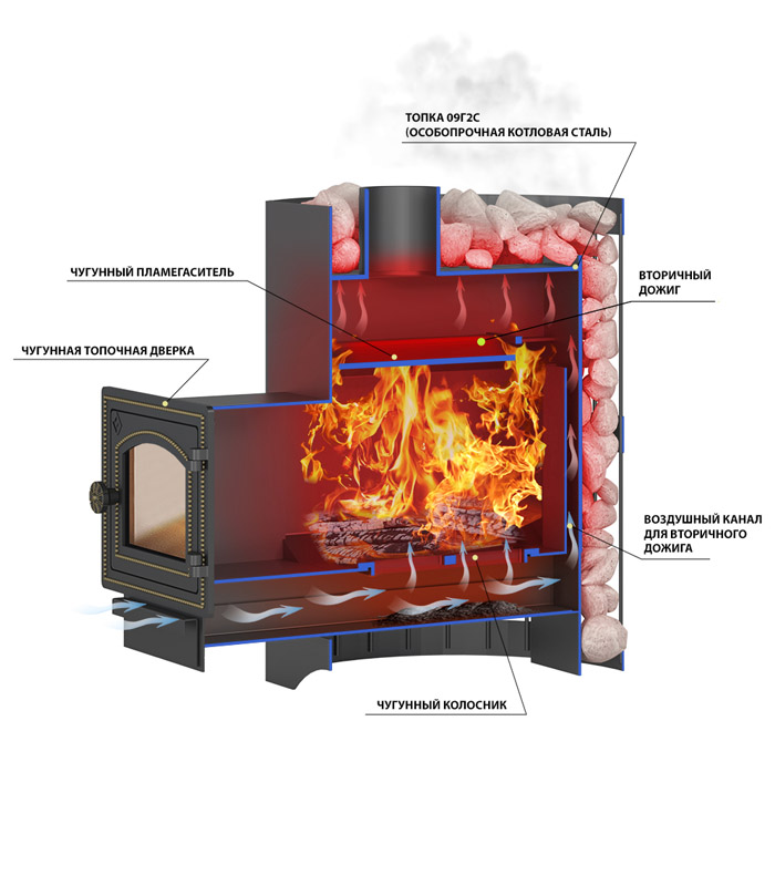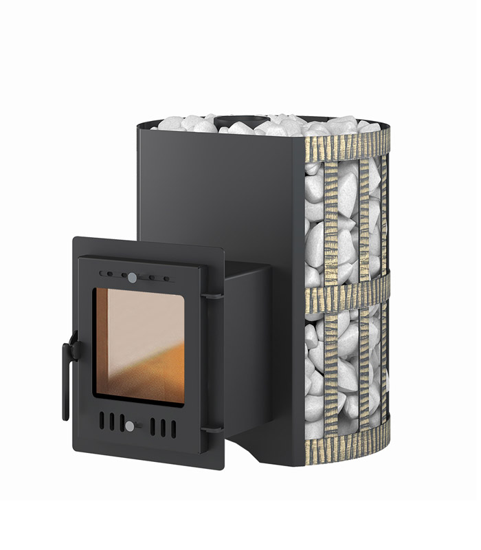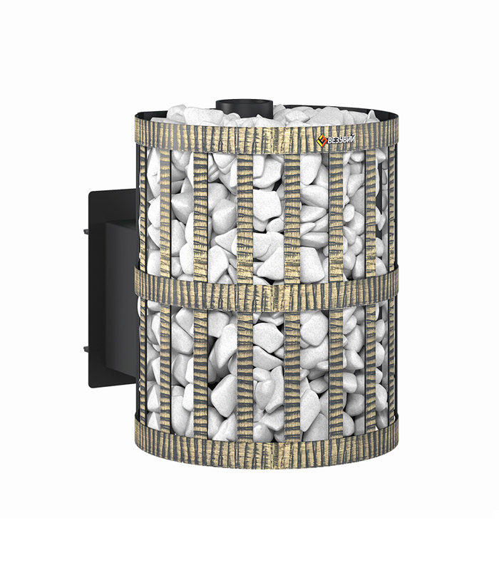 Открытая кожух-каменка выполнена в виде корзины, сплетённой из кованой стальной ленты. Заполнив сетку доверху банным камнем (110 кг), вы получаете идеально мягкую атмосферу и длительное сохранение комфортного тепла. Благодаря расположению камня вокруг топки, центральная часть раскаляется до очень высоких температур, что позволяет получить при подаче воды лучший лёгкий пар.