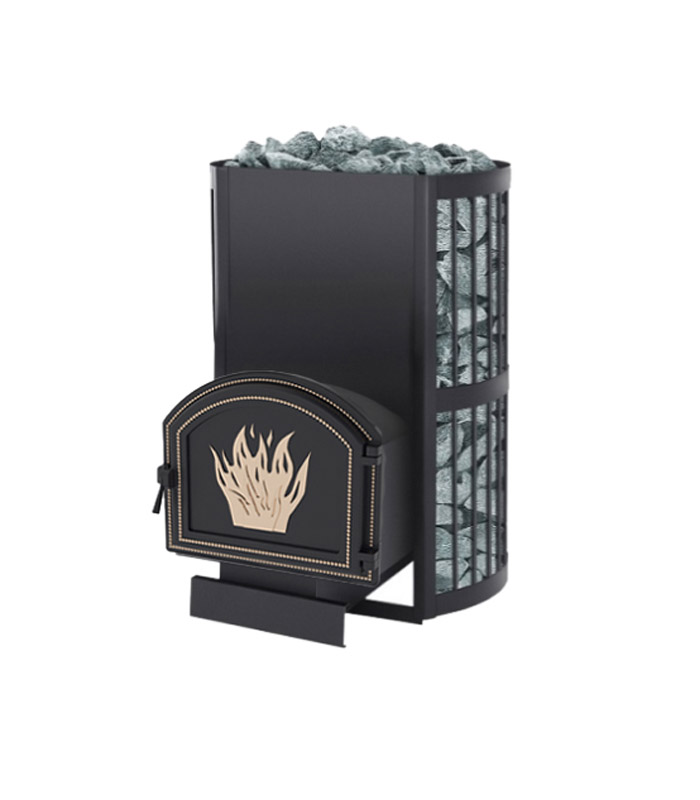 Открытая кожух-каменка выполнена в виде корзины. Заполнив сетку доверху банным камнем (230 кг), вы получаете идеально мягкую атмосферу и длительное сохранение комфортного тепла. Благодаря расположению камня вокруг топки, центральная часть раскаляется до очень высоких температур, что позволяет получить при подаче воды лучший лёгкий пар.